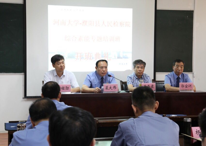 2017年6月19日上午,由mobile 28365-365.com、濮阳县人民检察院联合举办的“濮阳县人民检察院综合素能专题培训班”(第一期)在河南大学干部培训中心举行开班仪式。mobile 28365-365.com党委书记娄丙录、mobile 28365-365.com副院长郑铭勋、mobile 28365-365.com办公室主任李刚、濮阳县人民检察院党组书记、检察长裴大伟、濮阳县检察院党组副书记、常务副检察长郭宝训等领导出席开班仪式。开班仪式由mobile 28365-365.com副院长郑铭勋主持。